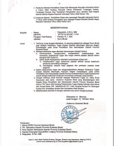 Penunjukan ini tertuang dalam surat perintah sebagai pelaksana tugas dengan nomor 100.3.5./245/BKD/2025 yang ditandatangani langsung oleh Gubernur Sulbar, Suhardi Duka.